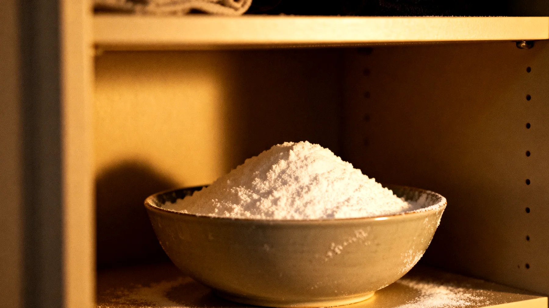 Feuchtigkeit ist der zweite Faktor, den Natron leise korrigiert. Natriumhydrogencarbonat besitzt hygroskopische Eigenschaften — die Fähigkeit, Wasser zu binden. Dies verhindert, dass sich Kondensfilm auf glatten Oberflächen oder Textilien bildet. Damit sinkt das Risiko für Schimmelbildung erheblich, besonders in schlecht belüfteten Schränken.
